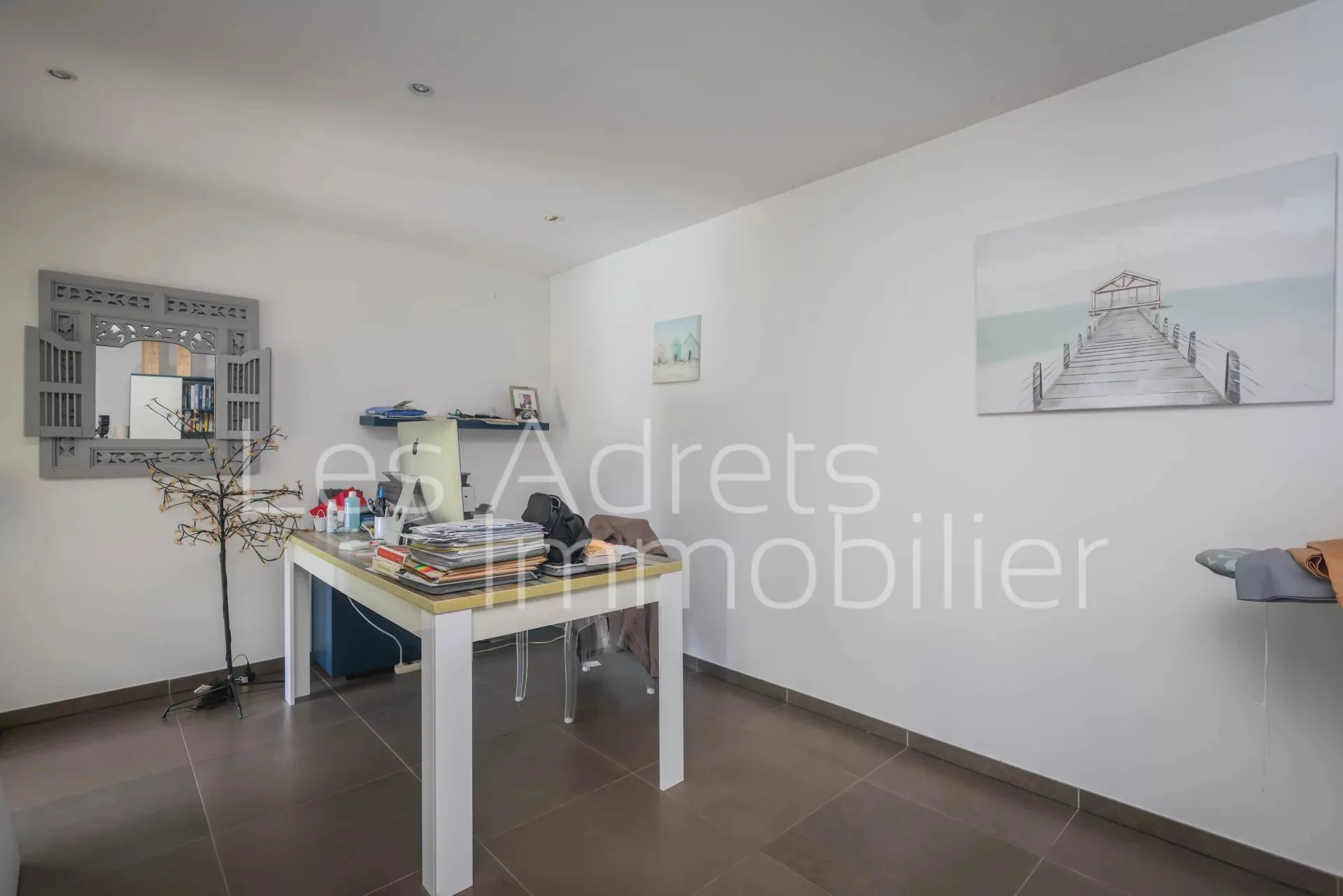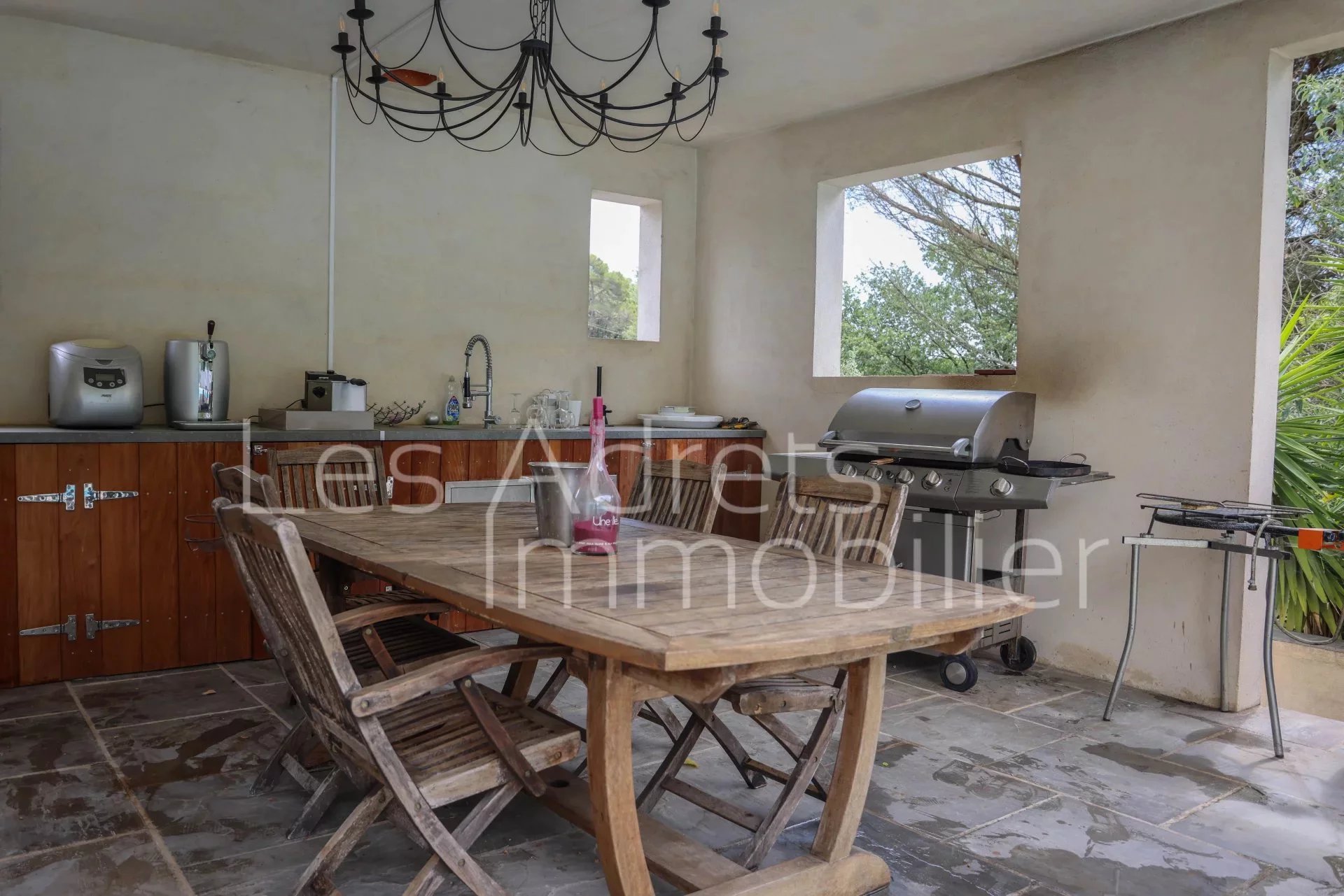 comprises on the ground floor: a comfortable living area, lounge with fireplace, semi-independent kitchen and pantry, as well as a bedroom and study, all opening onto a spacious terrace surrounding the swimming pool, complemented by an equipped pool house.
